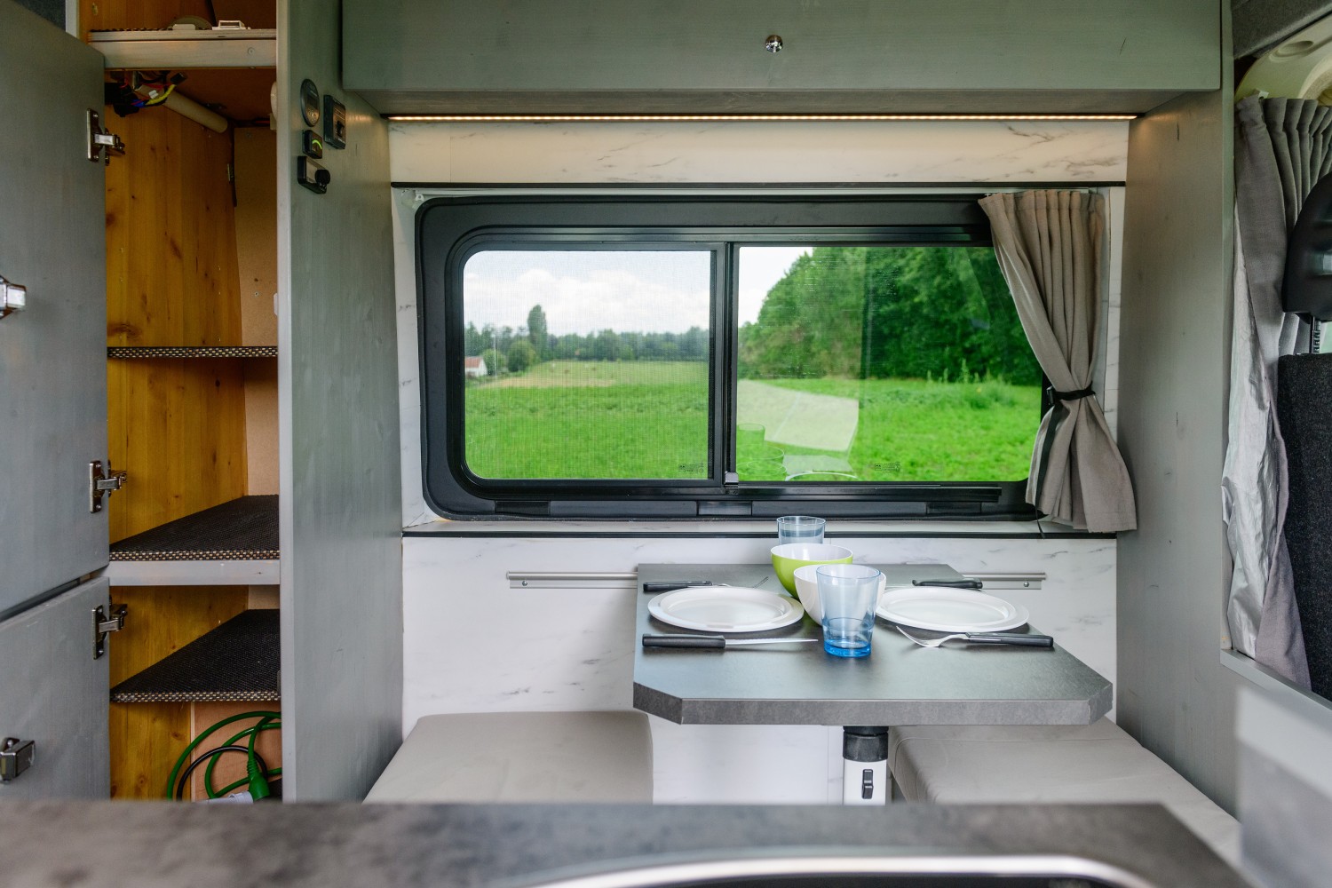 Heyhey, welkom bij KaiTen, een busje dat is omgebouwd tot een echte (Kitesurf)Van! Hij heeft wat je nodig hebt voor een uniek avontuur in de stad, aan zee of in de bergen. Aangezien deze van 2014 is kan de Van nog in verschillende lage emissiezones binnen (afhankelijk van de lokale regels natuurlijk, Crit'air vignette van Frankrijk inbegrepen net als het vignette voor Zwitserland van 2023)! Tijdens het rijden heeft hij 3 zitplaatsen met airco, cruise control, nieuw ingebouwde CarPlay/android-auto radio voor navigatie, elektrische ramen,... De grote huisbatterij wordt tijdens het rijden ook opgeladen met de overtollige stroom. Ook is er een trekhaak aanwezig. De Van is (slechts) 5m40 lang en past dus makkelijk op een normale parking plaats. Zoek je dus een compacte, goed uitgerus...te Van voor jouw vakantie, dan is KaiTen perfect voor jou. Indien je extra foto's wilt of andere vragen hebt, twijfel dan niet mij te contacteren. Een goede communicatie zal zeker bijdragen aan een fijne reis. De aangeduide ophaal en afzettijden zijn indicaties en hier kan dus, mits goede afspraak, van afgeweken worden. KaiTen heeft: - Veel ramen en een dakluik voor natuurlijk licht. - Gordijnen met zonnewering om de Van goed te verduisteren. - Groot zonnepaneel van 290WP en een 170amp batterij. - Dieselverwarming van 2KW om de koude momenten gezellig door te komen. - Insectenhor bij de zij- en achterdeur + bij de ramen die opengaan. - Een bed van ongeveer 1m40 breed. - Verschillende hangkasten. - 3 Schuifkastjes en verschillende gewone kastjes. - 2 Zitbanken met grote opslagruimte en een verschuifbare tafel om de ruimte zo handig mogelijk te benutten. - Een keukenblok met spoelbak, elektrische koudwaterkraan en een 3 pits gasfornuis aangesloten op een LPG-tank. - Ruime koelkast van 130L met vriesvak. - Ongeveer 90L verswatertank en 80L vuilwatertank. - Bestek, borden, glazen, kookpotten & kookpannen, keukenmessen,... - Dimbare led-verlichting voor extra sfeer en gezelligheid. - 4 x USB laadgelegenheden en 2 x 12V stekkers. - 2 x 230V stopcontact voor als je aan de stroom hangt. - Toilet "Porta Potti" op wieltjes. - Een Campinggaz vuur voor buiten dat werkt op de LPG-tank van de Van. - 2 stoelen en een camping tafel voor buiten. - Q-lima draagbare buitendouche met ingebouwde geiser voor snel warm water. - Onder het bed een heel grote garage voor sportgerief of extra bagage + plaats om vouwfietsen mee te nemen. - Mogelijkheid om 2 compacte vouwfietsen te huren voor een meerprijs van €50 per week voor beide.